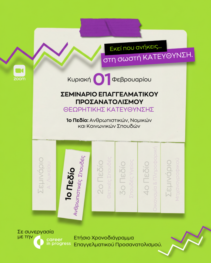 Ο Όμιλος ΝΟΥΣ σε συνεργασία με την Career In Progress στο πλαίσιο των Ολοκληρωμένων Εκπαιδευτικών Υπηρεσιών που παρέχει, διοργανώνει Ανοιχτή Διαδικτυακή Εκδήλωση Επαγγελματικού Προσανατολισμού Ανθρωπιστικών Σπουδών, την Κυριακή 01/02 στις 17.00.